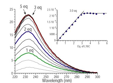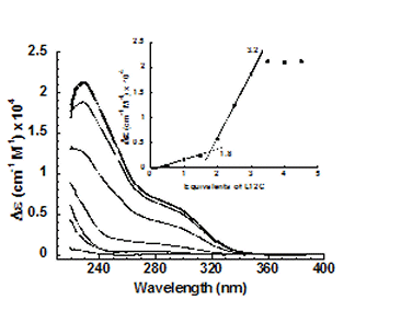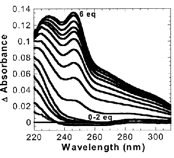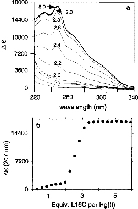 - At pH 4.5, the addition of excess peptide has no effect on the Hg(II)(TRI LC)2 aggregation state. In contrast, the addition of one additional equivalent of TRI L16C at pH 8.5 causes dramatic changes in the metallopeptide. As shown with the difference UV spectra on the right, a strong ligand to metal charge transfer transition develops upon addition of the third peptide equivalent