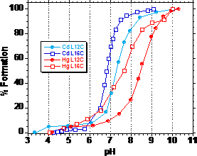 - Figure on the left shows the pH titration curves for Hg(II) with three equivalents of TRI L16C or TRI L12C. There is a marked shift in this titration curve towards higher pH when TRI L12C binding of Hg(II) is monitored.