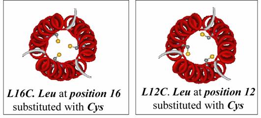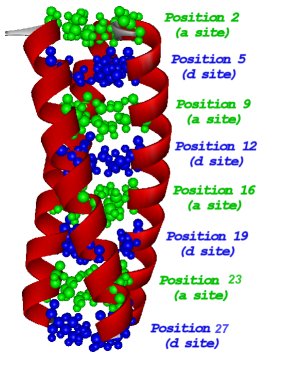 The hydrophobic residues are arranged in layers. Substitution of Leucine residues in a layer usually with cysteine leads to a soft metal binding site. The orientation of the Cysteine in the core is dependent on the type of site ("a" or "d") that has been modified.