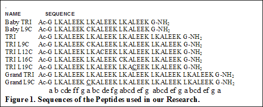 In all of the studies, the chosen metals do not bind to TRI and only form stable complexes with cysteine substituted peptides. Besides TRI, shorter peptides like Baby TRI, Baby L9C, Mini Tri, Mini L9C having 4,4,3 and 3 heptads have also been synthesized and used in our research. Similarly longer peptide like Grand TRI and Grand L9C having one heptad more than TRI have been synthesized and characterized.