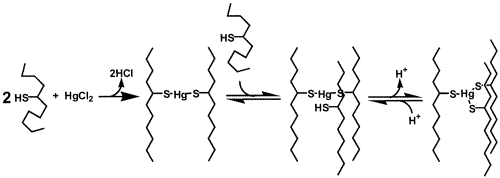 - The StepAD model provided not only a robust explanation for the encapsulation of Hg(II) within the interior of coiled coils, but also provided a basis for a proposed kinetic mechanism for the encapsulation of Hg(II) by unstructured peptides such as Baby L9C (Figure on the left). The proposed kinetic mechanism involves the initial rapid collapse of two peptide chains and a Hg(II) ion to form a two-stranded coiled coiled with linear thiolato Hg(II). The second step, addition of the third peptide to form a three-stranded coiled coil with linear thiolato Hg(II) encapsulated, is rate determining. The third step is a rapid deprotonation yielding the ultimate structure.