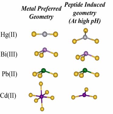 In many cases the geometrical preference of the peptide and the metal are different.The peptide can either form a dimer or a trimer while the metal geometry varies according to the metal prefrence, from two [Hg(II)], three [Bi(III) and Pb(II)], to even higher [Cd(II)]. Our interest is to investigate impact on protein structure and folding that results from the interplay between the metal and the peptide geometry ie. preferences. Investigation of the heavy metal binding is possible with the use of various techniques including UV, CD, EXAFS, PAC and NMR spectroscopy.