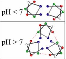 This design leads to a pH dependent structure. Protonation of the Glutamate residues at pH values above 7 lead to salt bridges that result in a three helical aggregate. At low pH the system is a two stranded coiled coil.