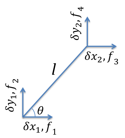 f1 and f2 correspond to the x- and y- components of the force acting on the first node of the element; likewise, f3 and f4 are the components of the force on the second node of the element. θ is defined as the angle the element makes to the x-axis of our coordinate system (so a horizontal element has θ = 0).