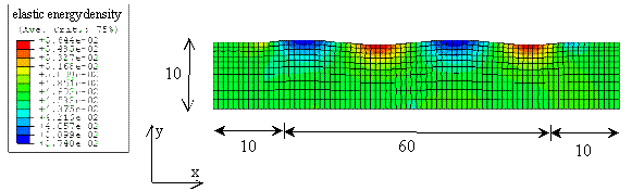 Fig. 2. Calculation domain and meshes generated by Abaqus. Our calculation domain is 60x10. We attached additional 10x10 grid to avoid edge effect. The color specifies the magnitude of the strain energy density. Abaqus then writes the strain energy associated with the nodes in the surface to the data file. Matlab reads the data file and evolves the node on the surface and write the updated nodal position to the new position-file. Repeat step b) In our simulation we didn't need to recalculate the strain energy density at every time step. If the position doesn't change too much, the strain energy from the previous step is still valid. We found that calculate strain energy at every 10 time steps is a compromise between speed and accuracy. The command for Matlab to call batch file is: system('callabaq.bat') The command in the batch file to call Abaqus is: CALL abaqus j=elasden.inp int, where elasden.inp is the name of the pre-programmed input file.