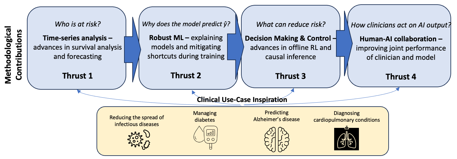In collaboration with 30+ clinicians and domain experts, we have identified areas with potential for high clinical impact and methodological impact. Through extensive preliminary work dedicated to understanding the clinical problem and the dataset that will be used, we formalize problems and develop new approaches. Our methodological contributions cluster into the following technical thrusts, driven primarily by four questions related to "who," "why," "what," and "how".