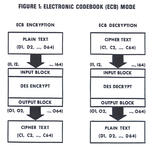 The Federal Data Encryption Standard (DES) (FIPS 46) specifies a cryptographic algorithm to be used for the Cryptographic protection of sensitive, but unclassified, computer data. This FIPS defines four modes of operation for the DES which may be used in a wide variety of applications. The modes specify how data will be encrypted (cryptographicaliy protected) and decrypted (returned to original form). The modes included in this standard are the Electronic Codebook (ECB) mode, the Cipher Block Chaining (CBC) mode, the Cipher Feedback (CF3) mode, and the Output Feedback (OFB) mode.